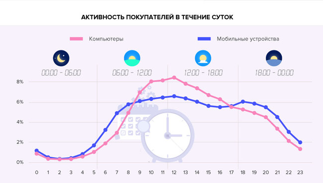 Пик покупательской активности приходится на 12 часов дня. В обед пользователи совершают около 9% покупок. Вообще активнее всего люди покупают в первой половине дня – с 10 утра до 13 дня. С компьютеров чаще всего покупают в пятницу, а со смартфонов – в среду и воскресенье.