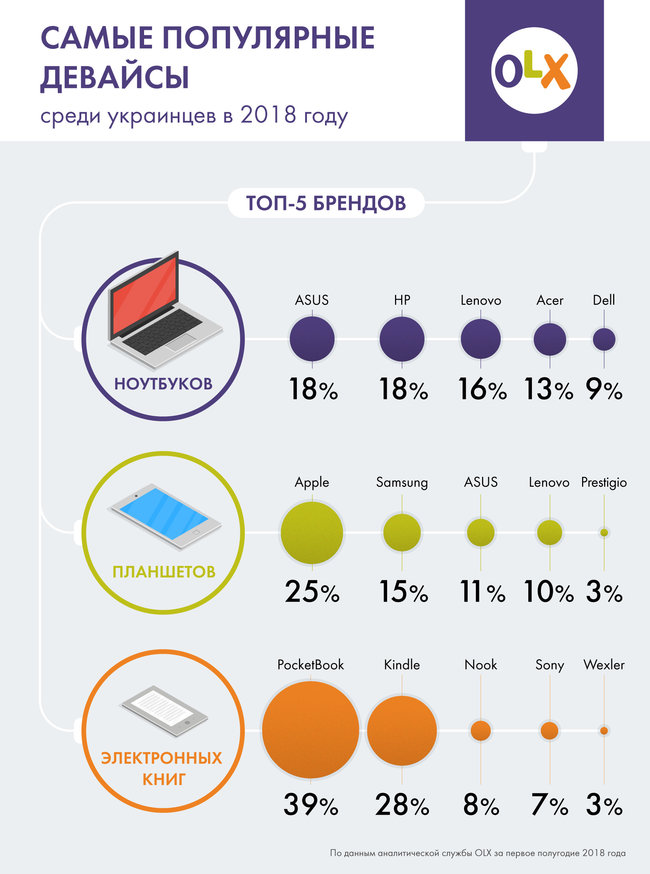 Техника стала самым популярным товаром, который покупают в интернете. По информации OLX в первом полугодии 2018 среди планшетов чаще всего покупали iPad. А среди ноутбуков украинцы выбирали ASUS и HP.
