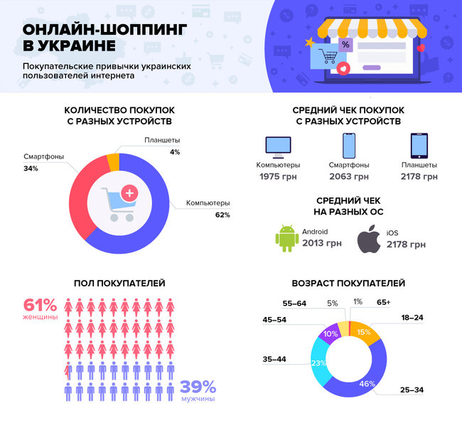 По данным немецкого института рыночных исследований GfK интернетом в Украине пользуется 20 млн человек. Из них 7 млн или 36% украинцев регулярно совершают покупку онлайн.