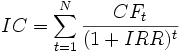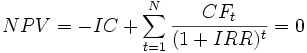 Иначе говоря, для потока платежей CF, где CFt — платёж через t лет (t = 1,...,N) и начальной инвестиции в размере IC = − CF0 внутренняя норма доходности IRR рассчитывается из уравнения: