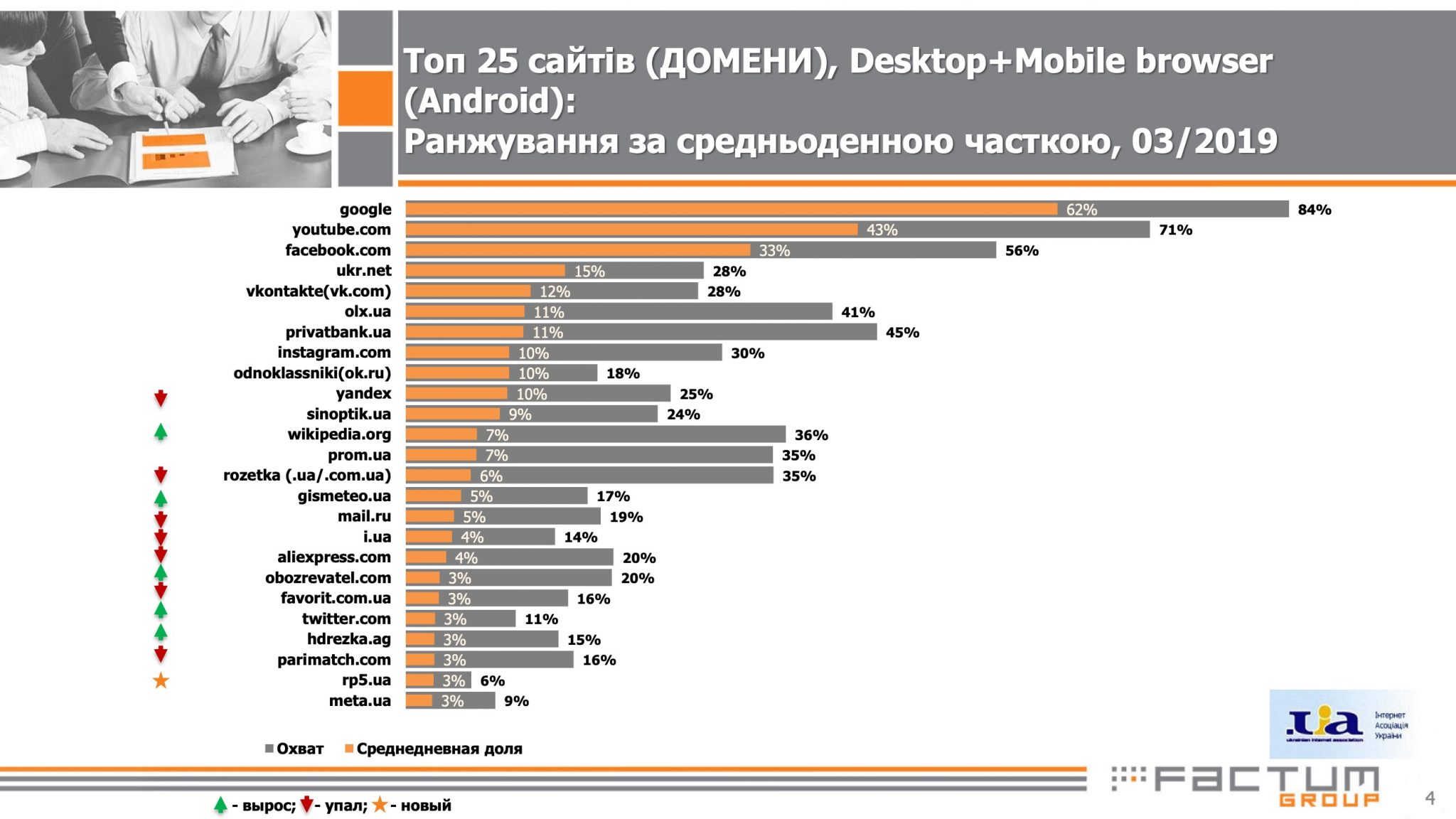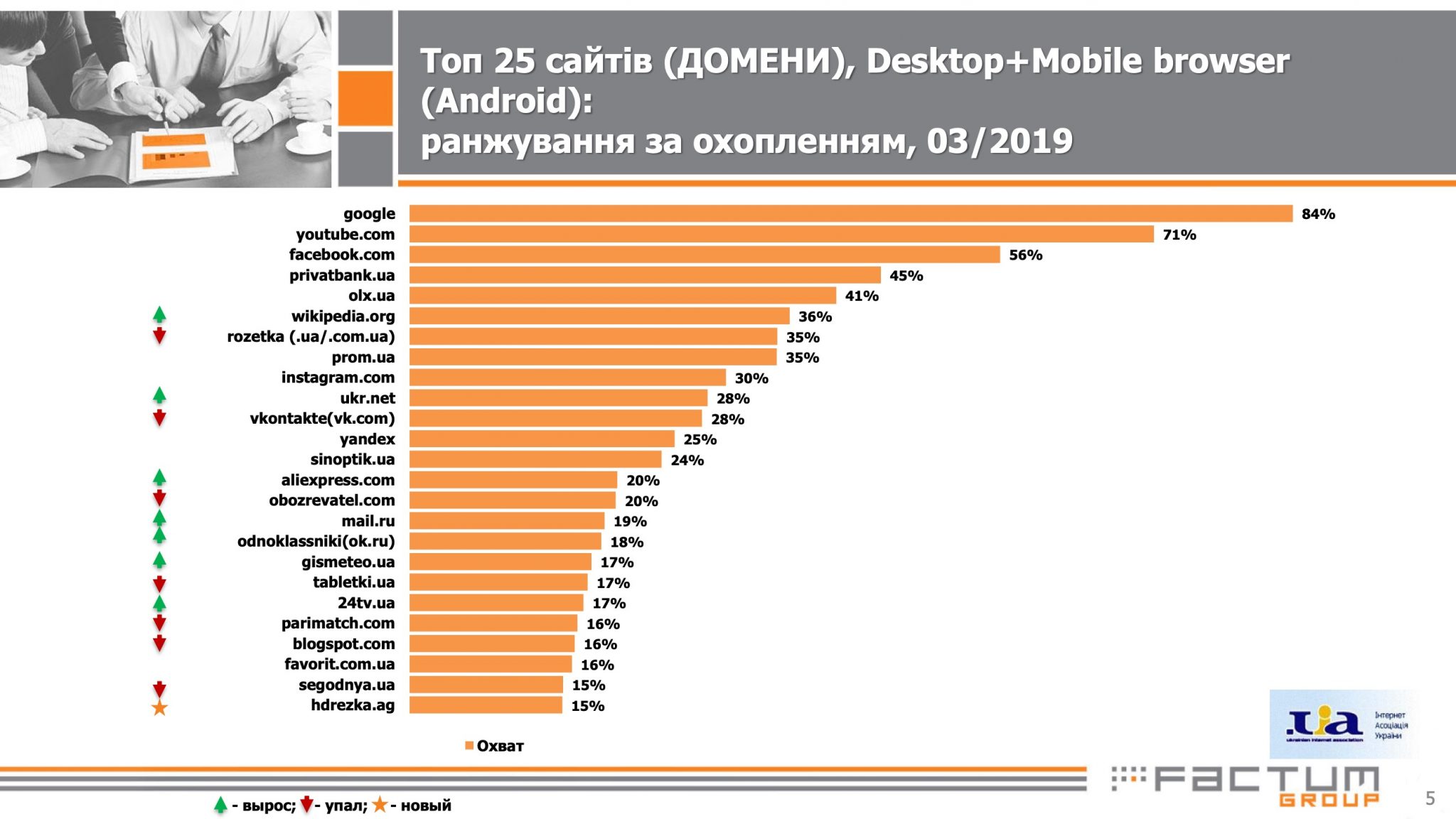 По результатам исследования среди самых популярных ресурсов украинского сегмента интернета присутствует сразу несколько порталов, связанных с электронной торговлей и сопутствующими сервисами. Так, на пятом месте с охватом в 41% укрепился сервис olx.ua. Крупнейший интернет-супермаркет Украины Rozetka.ua в мартовском рейтинге потерял одну позицию по сравнению с февралем, опустившись на седьмое место с охватом 35%. Такой же охват у Prom.ua, что позволяет ресурсу удерживать восьмую строчку. На 13-м месте — китайский маркетплейс aliexpress.