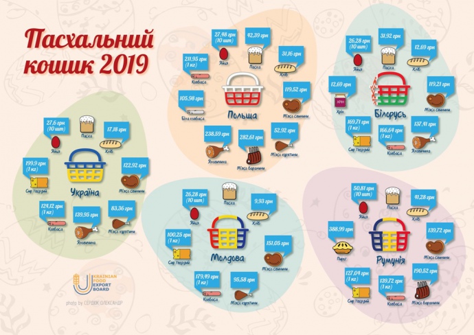 Аналитики сравнили стоимость наполнения украинской пасхальной корзины со стоимостью корзины у соседей: Польши, Беларуси, Румынии и Молдовы.