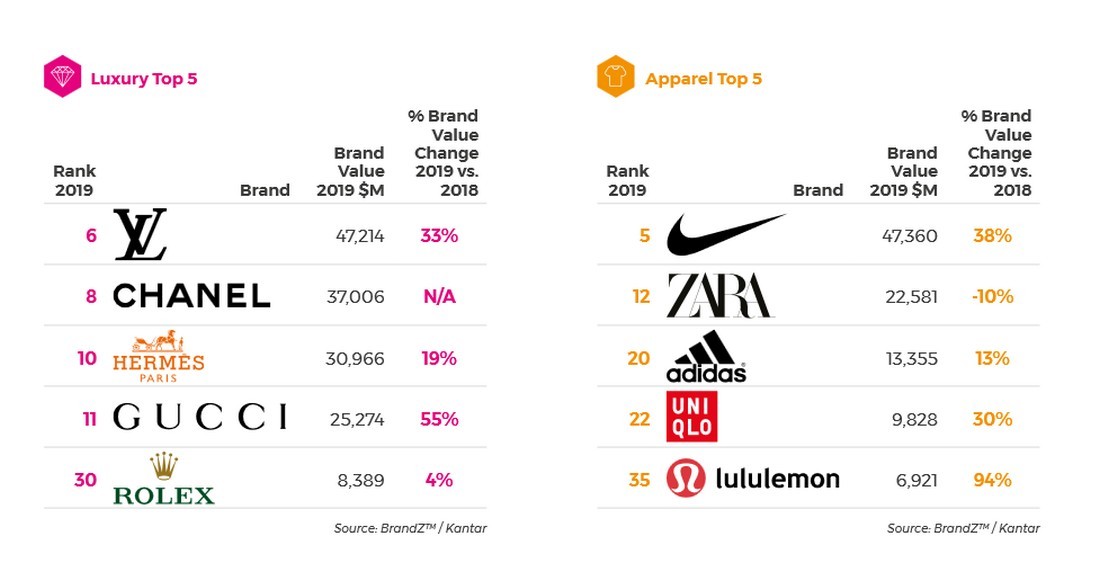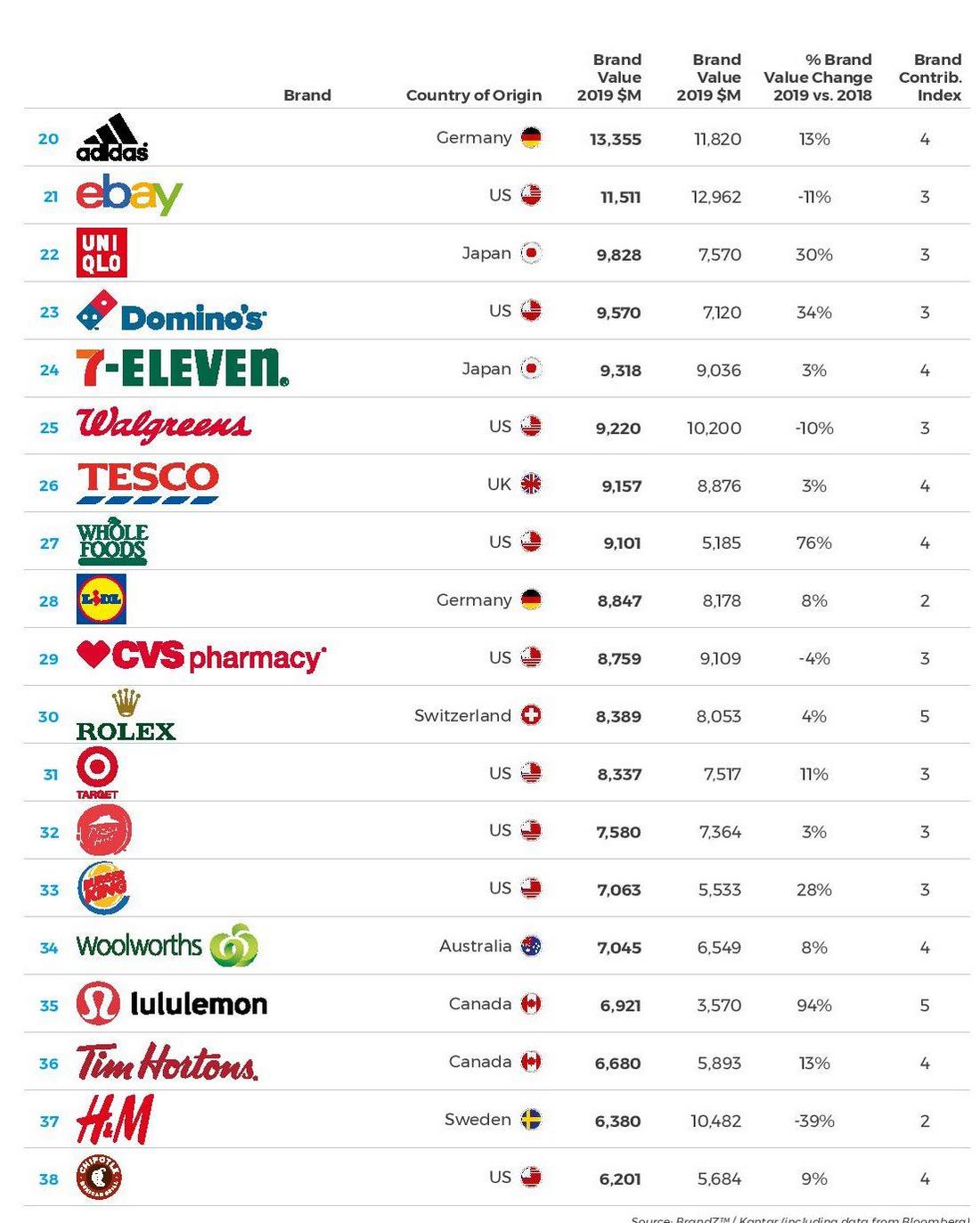 В список самых дорогих торговых марок мира входят представители самых различных секторов розничной торговли, но далеко не у всех из них стоимость бренда играет значительную роль. Так, специалисты BrandZ включили в рейтинг компании, занимающиеся не столько торговлей, сколько производством одежды и предметов роскоши: Nike, Adidas, Luis Vitton, Chanel и так далее. Разумеется, с точки зрения классического ритейла, основную стоимость их торговых марок составляет не розничная сеть, а производственные мощности и многолетняя репутация.