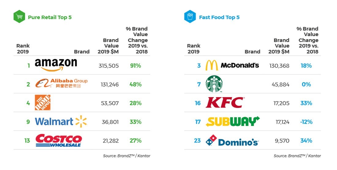 Общая стоимость 75-ти самых дорогих ритейл-брендов мира оценивается сейчас в $1,4 трлн, что на $339 млрд больше, чем в прошлом году. Четверть этой суммы (23%) приходится на Amazon, практически удвоивший стоимость бренда за год. Динамика занимающего второе место Alibaba заметно ниже — по сравнению с 2018-м цена бренда китайского конгломерата выросла на 48%.