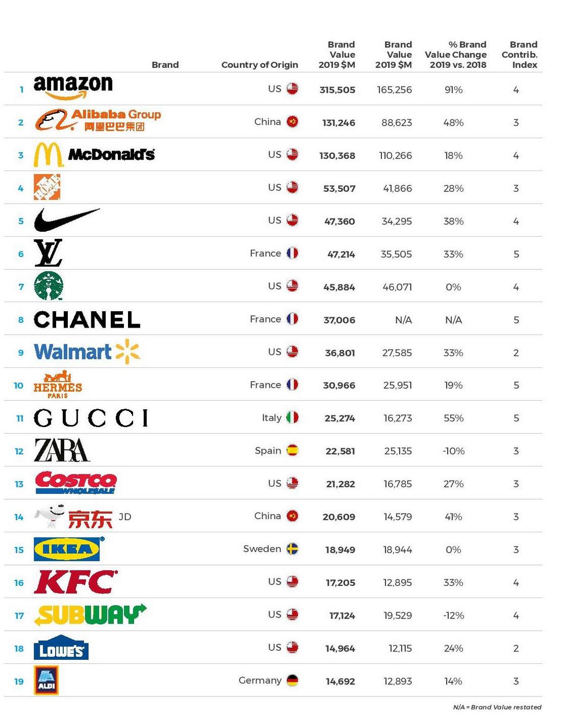 Онлайн-гигант, который лидировал и в 2018 году, по стоимости более чем в два раза обгоняет китайский Alibaba со стоимостью бренда в $131,2 млрд, занявший второе место. За год китайцы сумели подняться на одну ступень в рейтинге, потеснив на третье место McDonald’s, чей бренд оценивается $130,4 млрд.