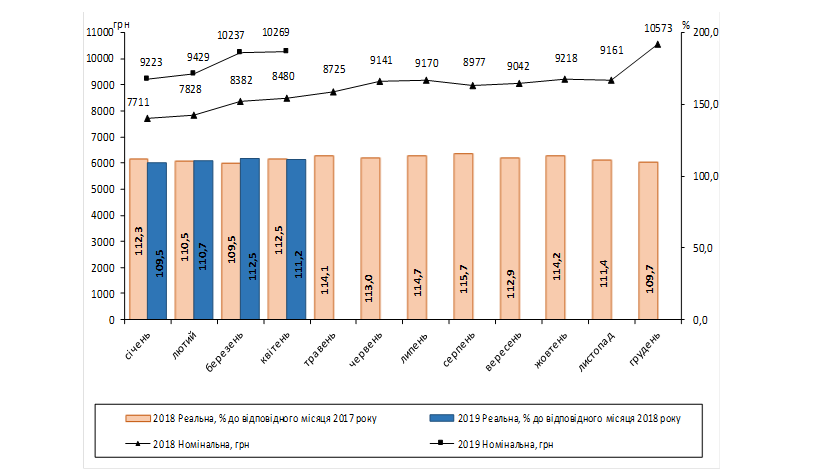 Согласно опубликованным данным Государственной службы статистики, средняя номинальная заработная плата штатного работника предприятий, учреждений и организаций в апреле 2019 года составила 10 269 грн, что в 2,5 раза выше уровня минимальной заработной платы (4173 грн).