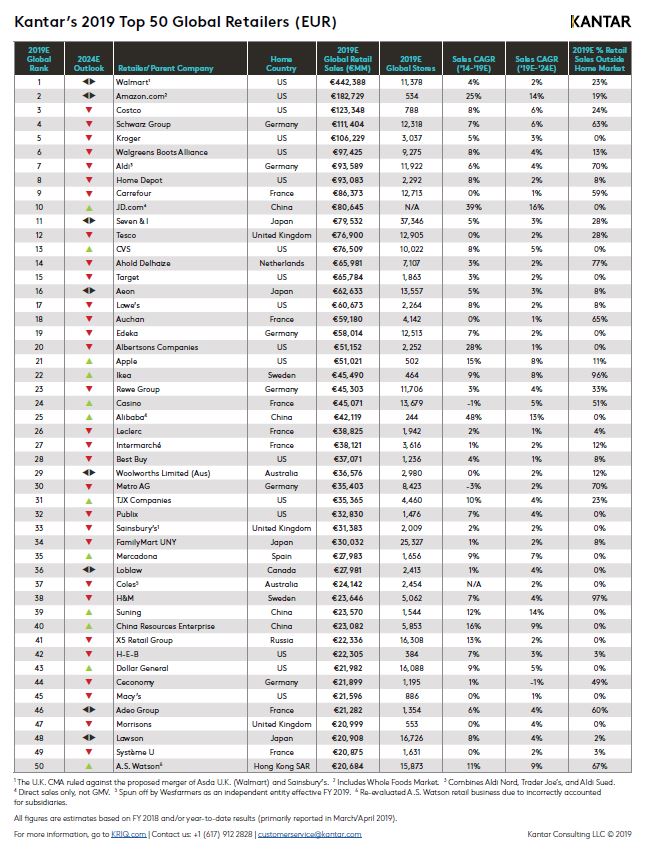 В рейтинге топ-50 глобальных компаний, опубликованном Kantar, американские компании пока доминируют, – шесть из десяти крупнейших ритейлеров имеют центральные офисы на территории США. Из них только Kroger действует исключительно на американском рынке, он находится на пятом месте списка.