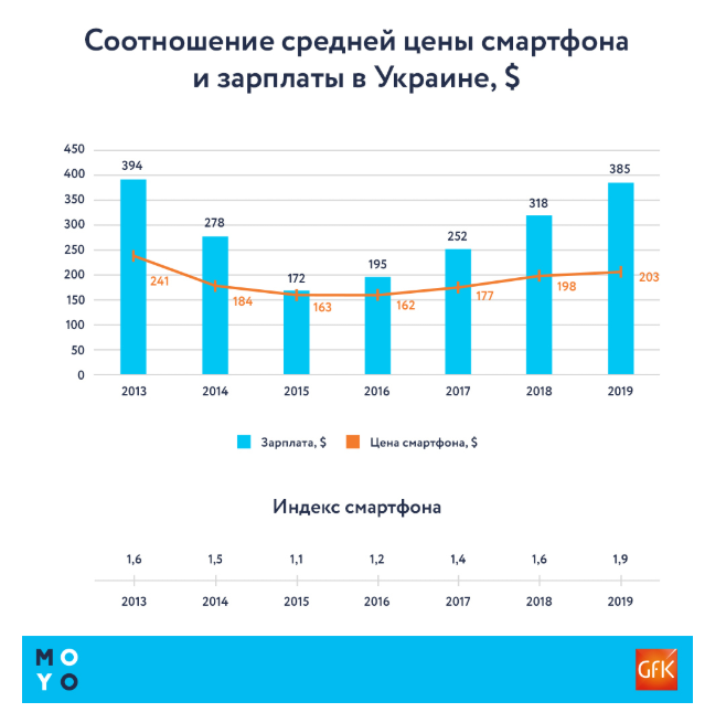 Средняя зарплата, по расчетам Moyo, в 2019 году составила $385 (около 10 000 грн), а "индекс смартфона" равен 1,9. В компании отмечают, что это самый высокий результат за последние шесть лет.