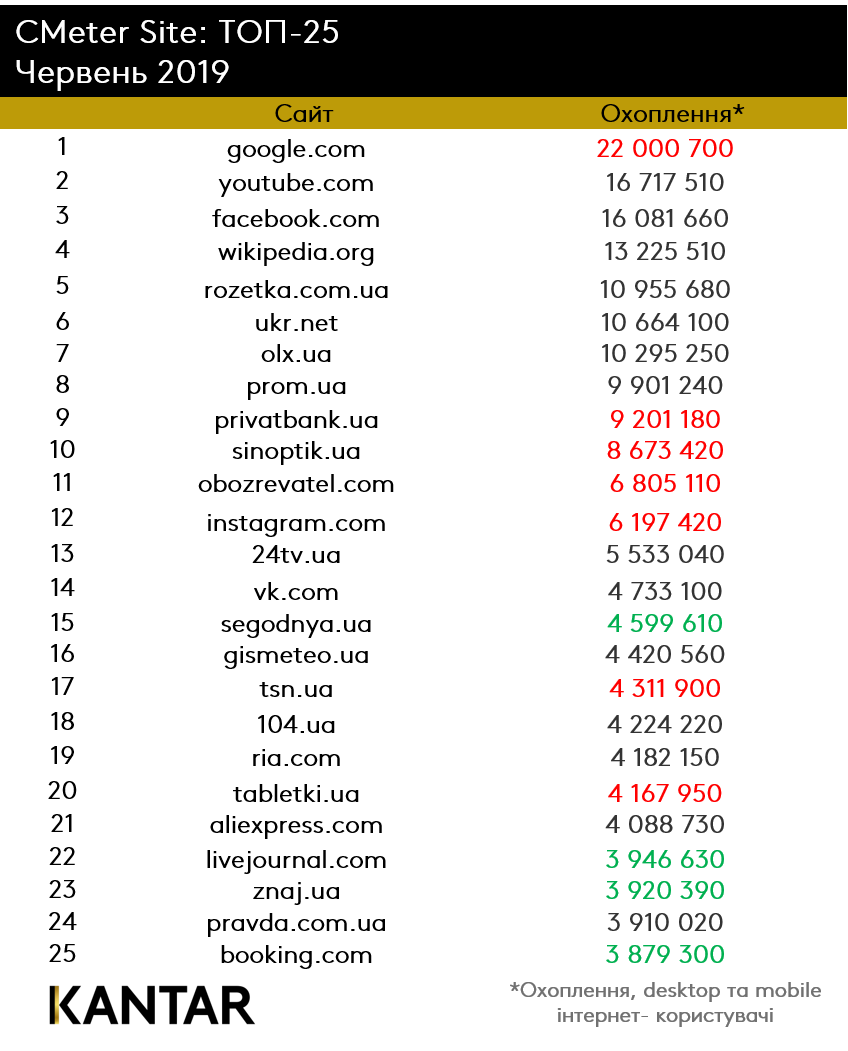 Тройка лидеров остается неизменной: Google, Youtube, Facebook. Среди представителей украинского e-commerce в рейтинге присутствуют крупнейший интернет-супермаркет страны Rozetka — на 5-м месте, сервис объявлений olx — на 7-м, маркетплейс prom.ua — на 8-м и портал aliexpress — на 21-м.