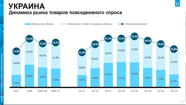 В первом квартале 2019 года в Украине цены на товары повседневного спроса (FMCG), такие, как продукты питания, напитки и туалетные принадлежности, выросли на 11,1%, а объемы продаж увеличились на 5,7% соответственно. В результате общие расходы украинцев на товары повседневного спроса выросли на 16,8%. Об этом свидетельствуют результаты исследования Nielsen Growth Reporter, которое компания Nielsen проводит в 28-ми странах Европы.