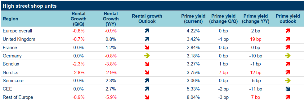 Снижение оборота розничной торговли в Еврозоне и изменение покупательских привычек из-за развития онлайн-торговли привели к снижению активности вдоль европейских торговых коридоров. Арендные ставки упали на 0,6% за квартал и на 0,9% в годовом исчислении — самое большое годовое падение с 2009 года. Только два из 46 отслеживаемых рынков продемонстрировали рост арендных ставок — София (3,8%) и Вена (1,3%).