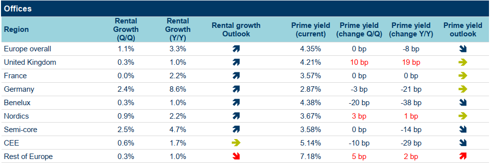 Ставки доходности на наиболее качественные офисные помещения остались на уровне 4,35%, самом низком с момента начала исследований в июне 2002 года. Арендные ставки в сегменте выросли на 1,1% по сравнению с предыдущим кварталом, а в годовом исчислении — на 3,3%, что является самым быстрым темпом роста с 2012 года. Германия остается лидером: арендные ставки выросли на 2,4% в квартальном исчислении на фоне высокого спроса и недостаточного объема предложения в классе А.