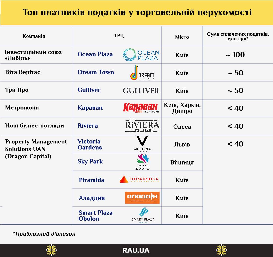 Больше всего налогов и сборов в казну перечислили собственники столичного ТРЦ Ocean Plaza. Также в список попали владельцы киевского Dream Town, МФК Gulliver, сети ТРЦ Караван, одесского торгово-развлекательного комплекса Riviera, а также девелоперское подразделение инвесткомпании Dragon Capital, управляющее рядом ТРЦ и других объектов коммерческой недвижимости.