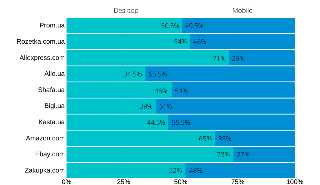В EVO обратили внимание на интересную закономерность: на украинские маркетплейсы пользователи чаще заходят с мобильных, чем с десктопа. В то время, как на китайские и американские — преимущественно с компьютера.