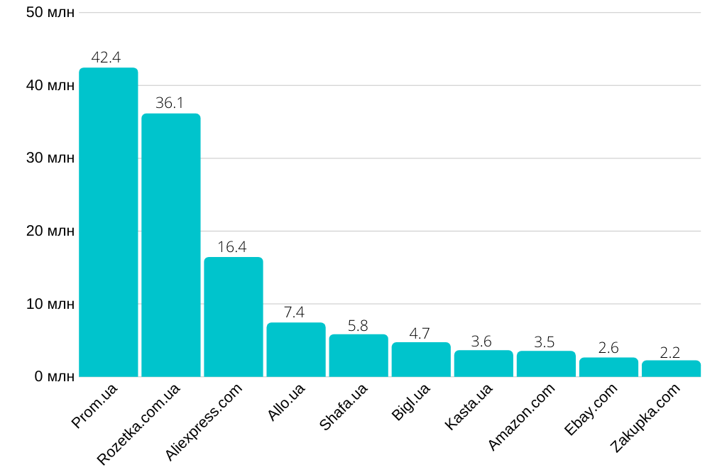 Согласно данным EVO.Business, самый посещаемый маркетплейс Украины — Prom.ua. За ним идет Rozetka и Aliexpress. В компании отмечают, что учитывался только трафик из Украины.