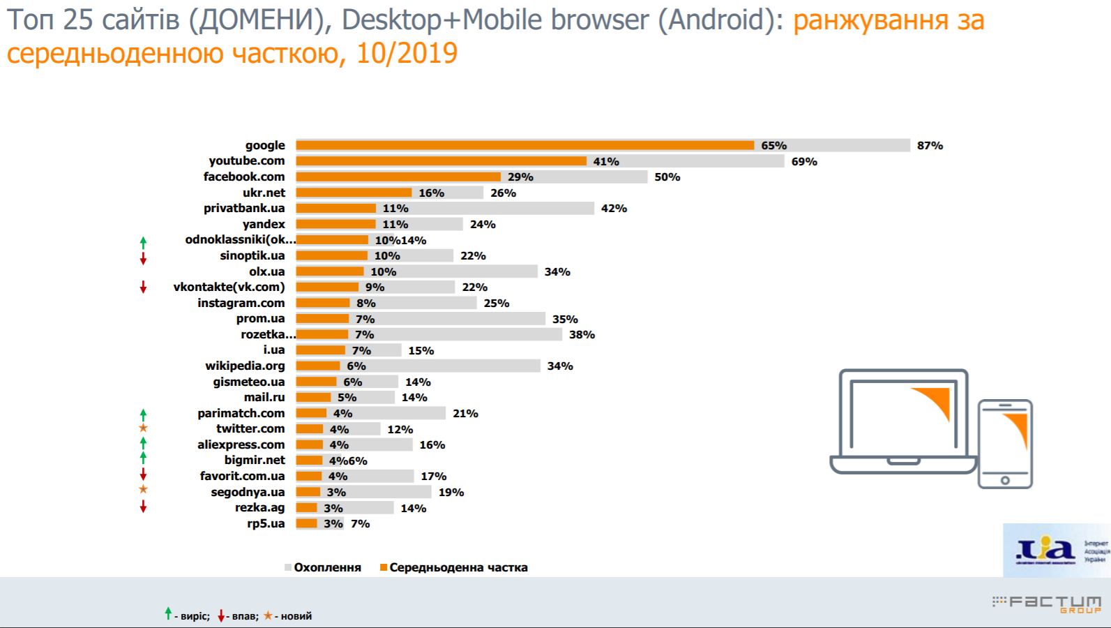 Ассоциация ИнАУ опубликовала данные очередного исследования популярности сайтов и приложений в украинском интернете. Его провела компания Factum Group Ukraine. Данные собраны на базе медиапанели из 5000 человек.