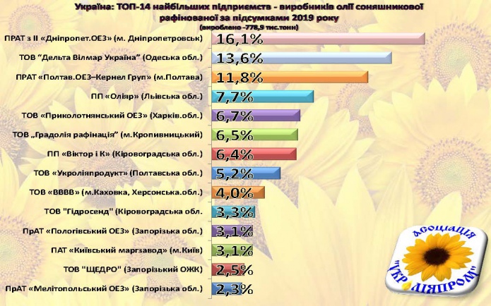 Лидером в сегменте рафинированного масла стало ЧАО с иностранными инвестициями «Днепропетровский МЭЗ» (Bunge), который занял 16,1% рынка. Второе — ООО «Дельта-Вилмар СНГ» с 13,6%, третье — ЗАО «Полтавский МЭЗ» («Кернел») с 11,8% - пишет Agroportal.ua