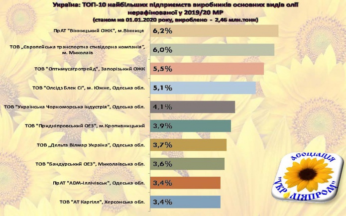При этом с начала 2019/20 МГ по состоянию на 1 января 2020 лидером по производству нерафинированного масла стало ЗАО «Винницкий МЖК» (Vioil) с долей рынка в 6,2%, второе — ООО «Европейская транспортная стивидорная компания» («Бунге») с 6% рынка, третье — ООО «Оптимусагротрейд» («Агрокосм», Запорожский МЖК) с 5,5% рынка.