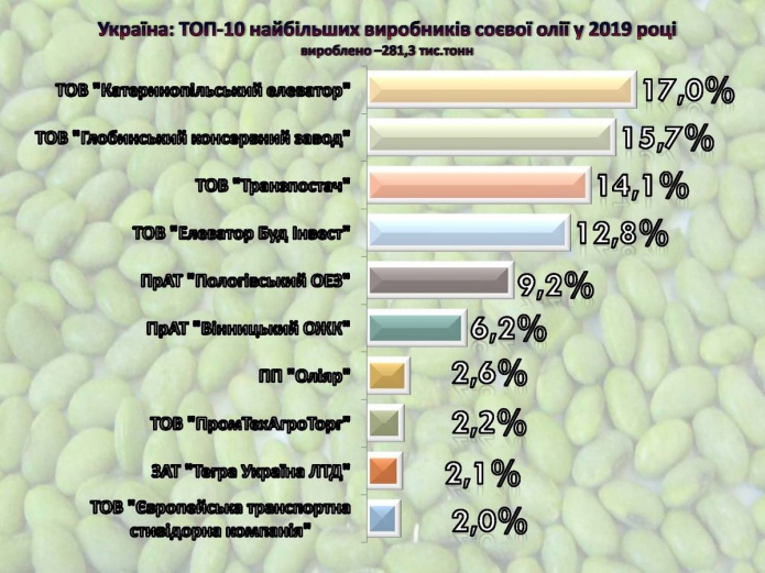 Лидером по производству продукции за отчетный период стало ООО «Катеринопольский элеватор» (МХП), которое выпустило 17% от общего количества этого вида продукции. Вторым — ООО «Глобинский перерабатывающий завод» («Астарта»), который занял 15,7% рынка соевого масла, третий — ООО «Транзпостач» (14,1%).