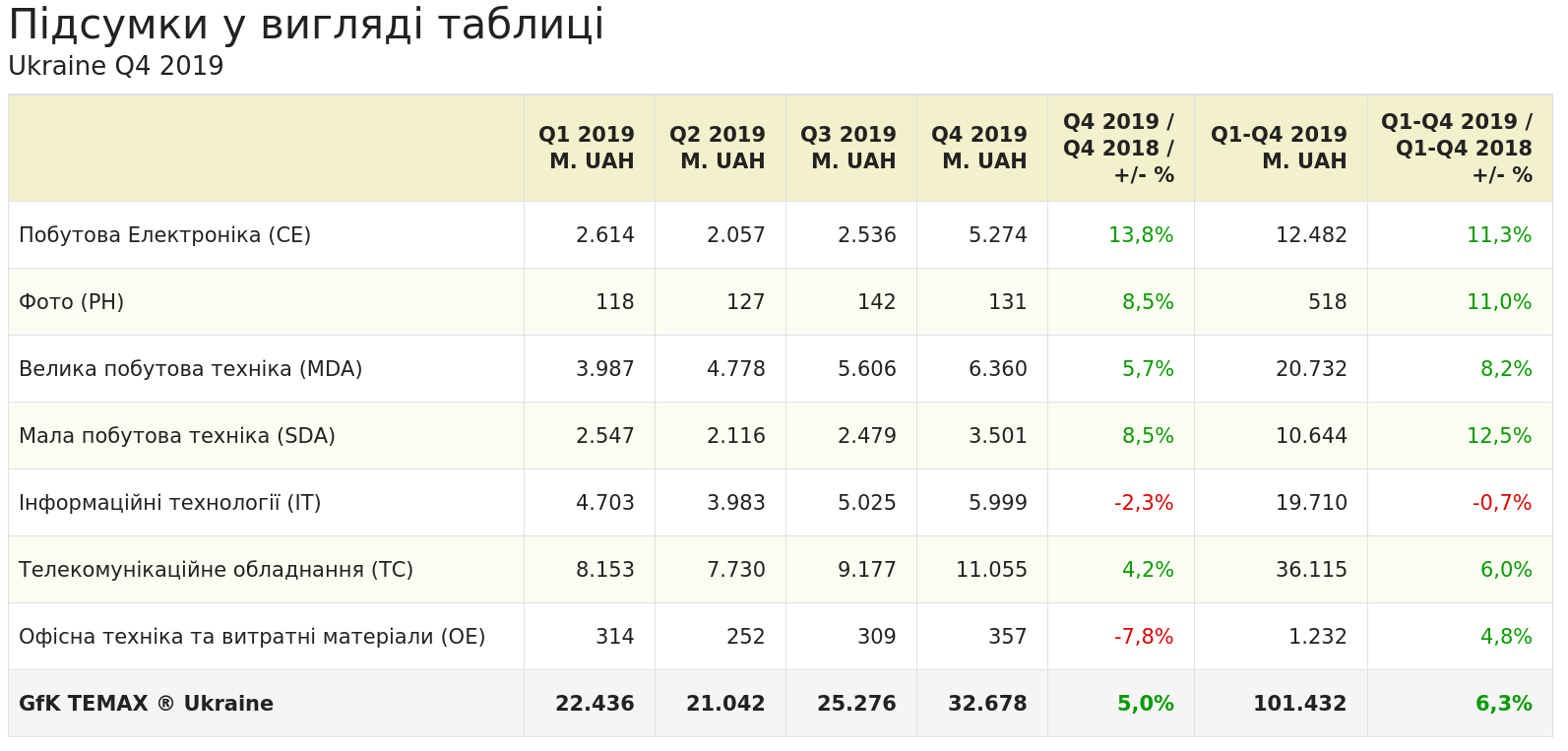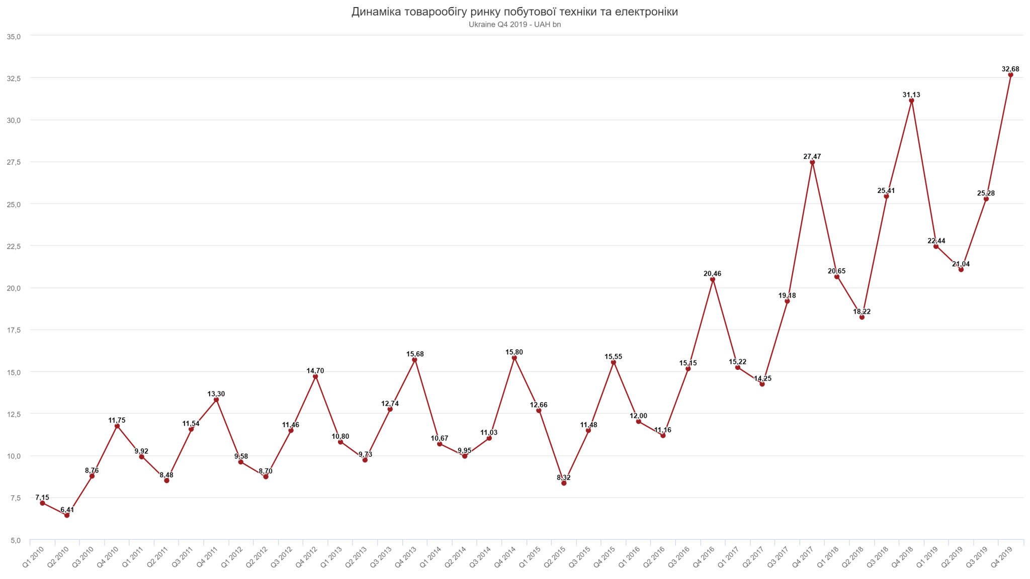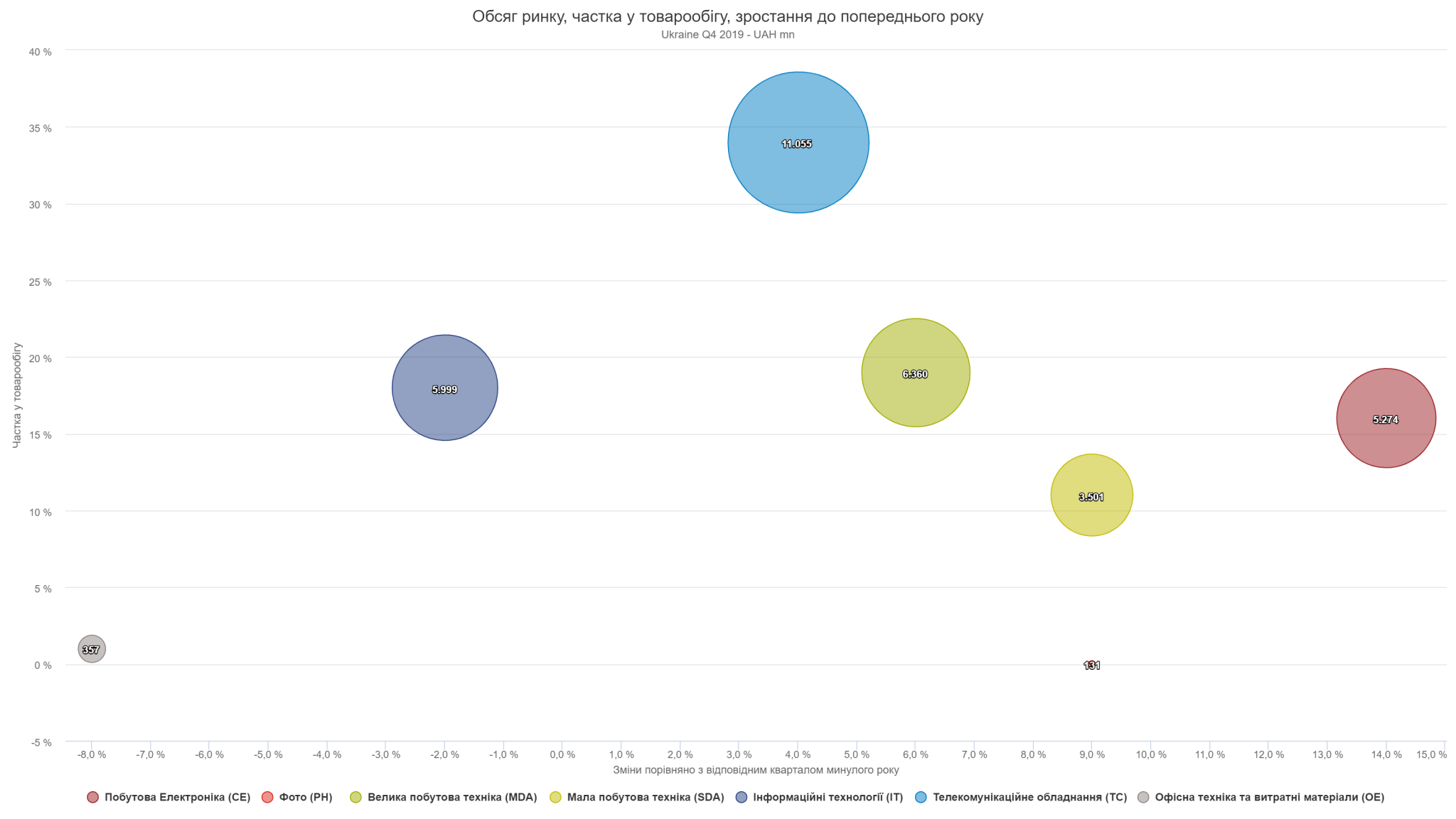 Аналитики GfK также сообщили, что в IV квартале 2019-го общий объем продаж бытовой техники и электроники показал рост на 5% по сравнению с аналогичным периодом 2018 года, составив 33 млрд грн. Наиболее активно в заключительном квартале года рос сегмент бытовой электроники (5,3 млрд грн, +13.8%). А наибольшее снижение показали сектора информационных технологий и офисной техники — на 2,3% и 7,8% соответственно по сравнению с IV кварталом 2018-го.
