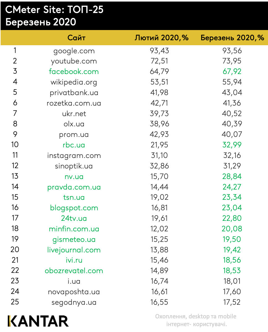 В то же время, согласно данным Kantar CMeter, новостные ресурсы и образовательные порталы для школьников существенно увеличили свои охвата в марте. Также украинцы искали лекарственные препараты, в частности на сайтах Apteka911.com.ua и Tabletki.ua. В топ-100 сайтов вошел Covid19.com.ua — официальный портал Кабмина, посвященный ситуации с коронавирусом в Украине.