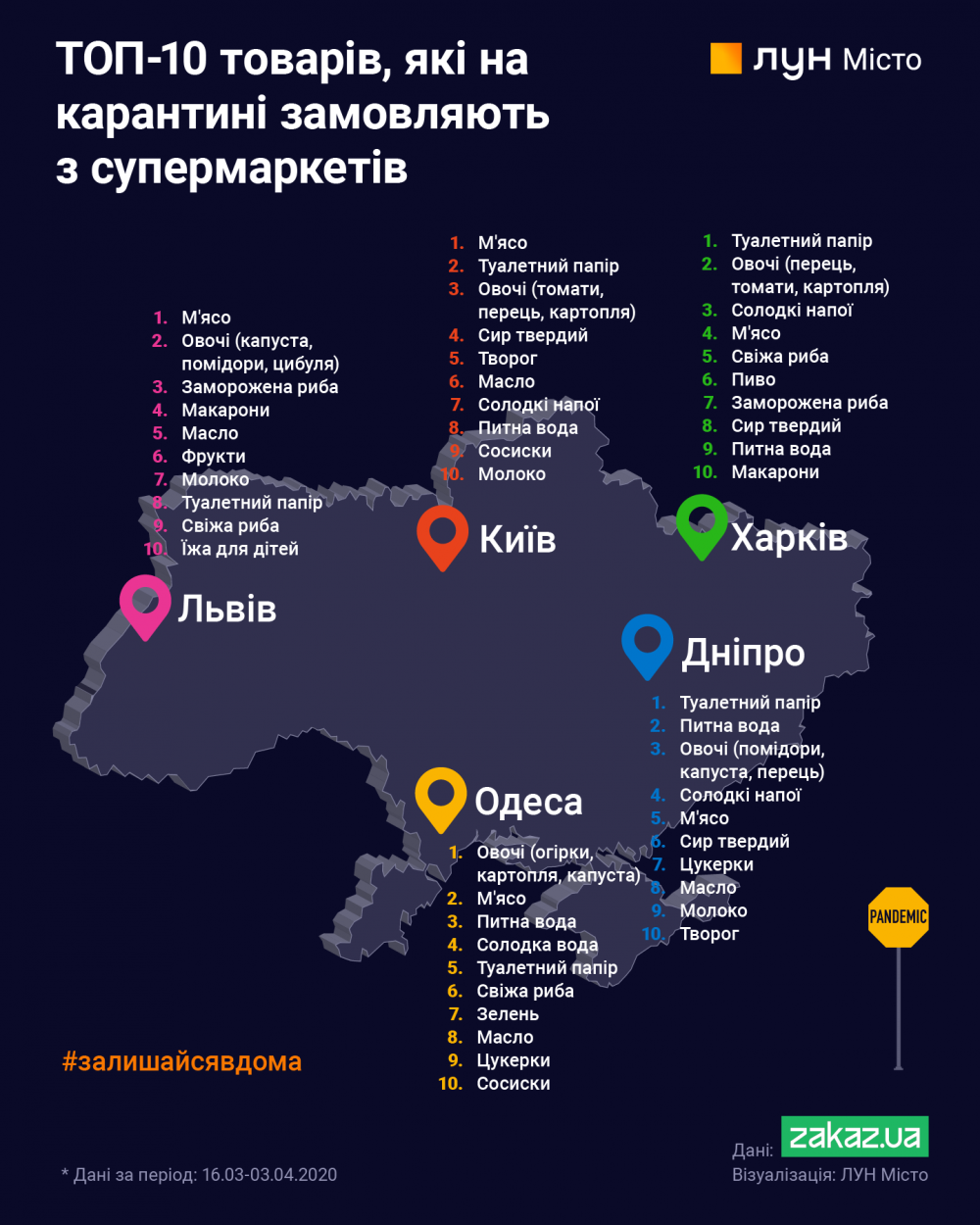 Такие данные приводит портал Delo.ua, со ссылкой на результаты анализа онлайн-корзин, который ЛУН Місто провел с сервисом доставки продуктов из гипермаркетов Zakaz.ua. Анализировались заказы Киева, Днепра, Львова, Одессы и Харькова за первые три недели карантина — от 16 марта до 4 апреля.