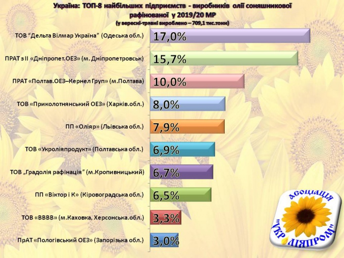 Лидером в сегменте рафинированного масла стало ООО «Дельта-Вилмар СНГ», которое заняло 17% рынка, второе — ЧАО с иностранными инвестициями «Днепропетровский МЭЗ» (Bunge) с 15,7%, третье — ЗАО «Полтавский МЭЗ» («Кернел») с долей 10%.