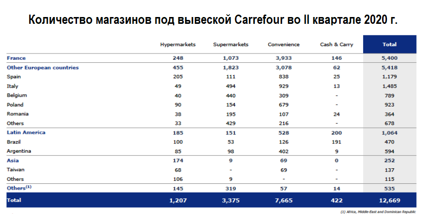 В конце II квартала 2020 года Carrefour Group управляла сетью из 12669 магазинов, из которых 5400 работали в родной Франции. Во всем мире под брендом Carrefour или другими, контролируемыми торговой группой ритейлерами, насчитывалось 1207 гипермаркетов, 3375 супермаркетов, 7665 магазинов у дома и 422 магазина формата cash&carry.