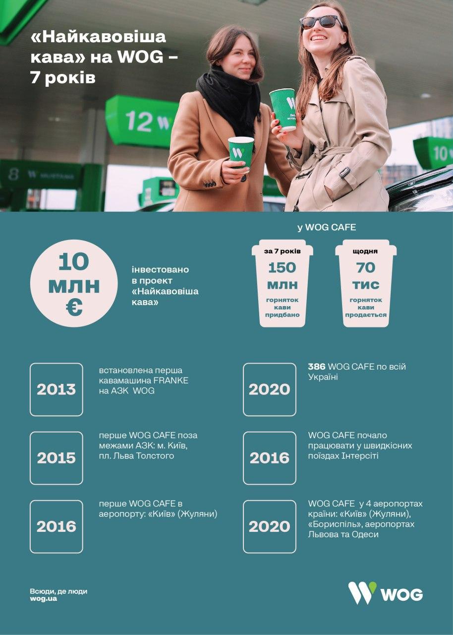 Проект «Найкавовіша кава» начат в 2013 году, когда сеть WOG приобрела и запустила в работу первую профессиональную кофемашину производства швейцарской фирмы FRANKE. За семь лет существования проекта открыто 386 WOG CAFE по всей Украине — из них 14 заведений, начиная с 2016 года, работают в скоростных поездах Интерсити и Интерсити+. Также в 2016 году открыто WOG CAFE в международном аэропорту «Жуляны» (Киев), в 2018 году аналогичное заведение заработало в международном аэропорту «Борисполь» (Киев), а в 2019 году еще два WOG CAFE появились в аэропортах Львова и Одессы. К тому же еще одно заведение работает в городском формате — кофейня расположена во Львове. Все учреждения оборудованы современными кофейными машинами FRANKE.