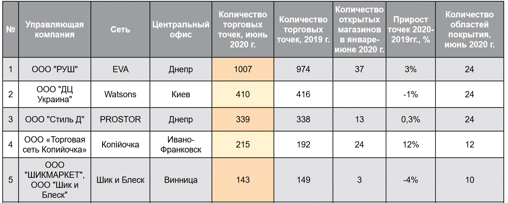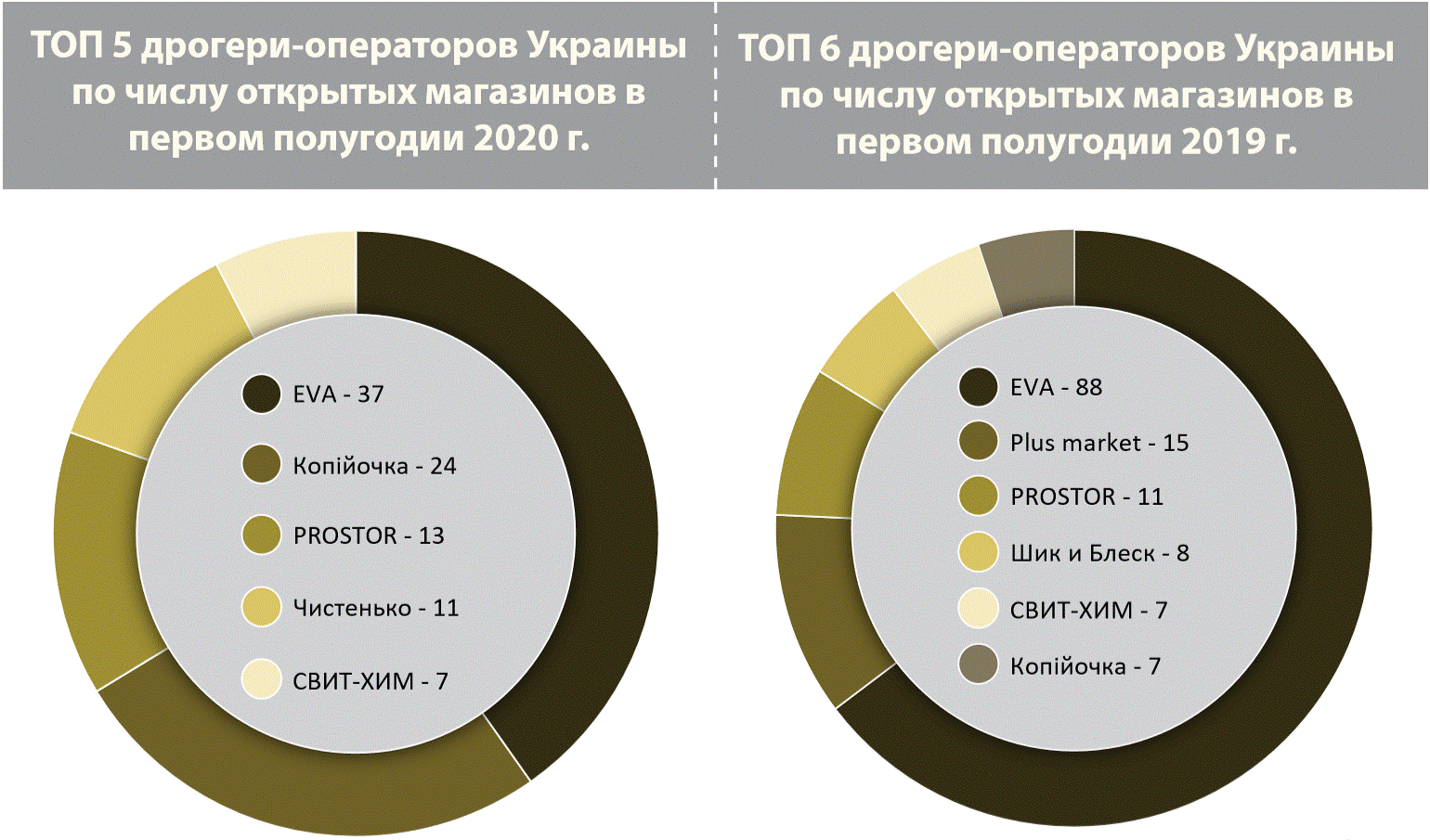 Упомянутая сеть EVA продолжала быть наиболее активным оператором на украинском рынке розничной торговли товарами бытовой химии и личной гигиены и в первом полугодии 2020 г. Именно этот ритейлер открыл самое большое количество новых объектов за 6 месяцев 2020 г. — 37 магазинов. Правда, это в два с половиной раза меньше, чем в первом полугодии 2019 г. (88 новых объектов).