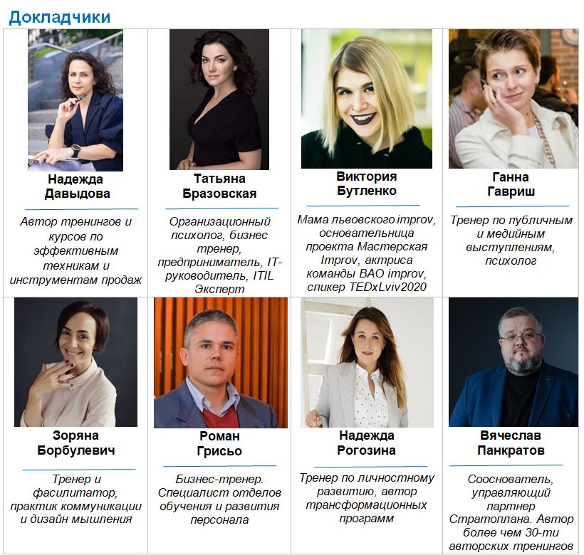 Профессиональные спикеры будут делиться своим опытом в бизнесе и на пути саморазвития, мобилизовать и мотивировать своими примерами, что обязательно придаст Вам сил и энергии для рывка, к которому Вы так давно стремились.
