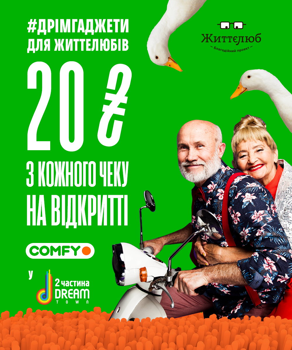 По случаю открытия COMFY будут отчислять 20 гривен с каждого чека в Благотворительный Фонд Життєлюб. Средства пойдут на # ДРИМГАДЖЕТЫ для подопечных фонда: мультиварки, чайники и тому подобное. Такие простые в современном мире вещи и такие желанные для многих людей пожилого возраста.