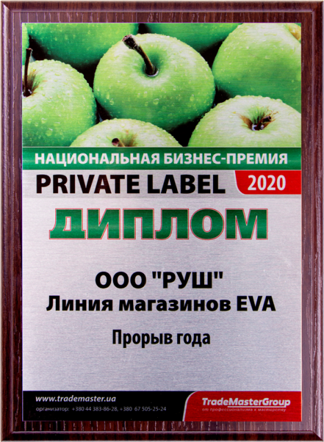 Стоит отметить, что в 2019 году компания впервые получила престижную награду от крупнейшей международной выставки в области частных марок PLMA (Priva teLabel Manufacturers Association) в Нидерландах в номинации «Модные аксессуары» за колготки СТМ Viv’en Petty и награду «За лидерство в управлении собственными косметическими торговыми марками» от выставки InterCHARM. В сентябре 2020 году во второй раз победила на международной выставке-конкурсе PLMA 2020 International «Salute to Excellence Awards» собственная торговая марка Линии магазинов EVA — «Green Way Wooden stick». А до этого еще один собственный бренд компании — Genetic Lab GEN 96 — получил награду на международном конкурсе дизайна и упаковки собственных торговых марок Vertex Awards. И вот очередной успех компании в Киеве.