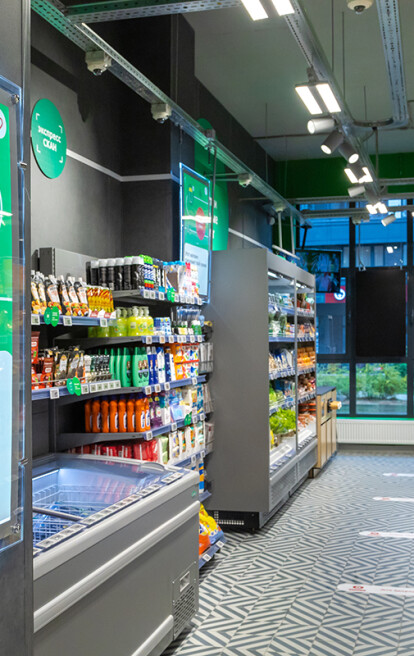 Магазин самообслуживания предлагает покупателям около 900 наименований товаров, в том числе свежие продукты и кофе. Ассортимент адаптирован для покупателя из мегаполиса, который хочет совершать покупки быстро и удобно.
