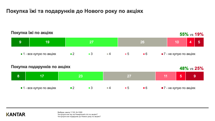 Украинцы склонны делать покупки к Новому году по акциям. Еду по акциям покупают 55% опрошенных, подарки — 48%.