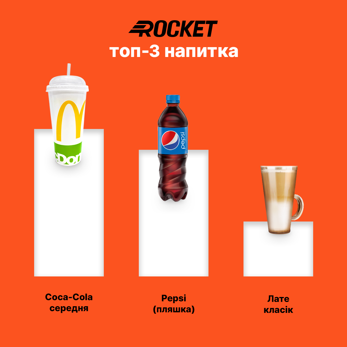 Среди напитков наибольшим спросом пользуется Coca-Cola. Она обогнала своих вечных конкурентов — Pepsi, которым досталось второе место рейтинга. Третьим по популярности напитком является латте.