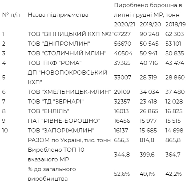 Так, лидером производства муки в первой половине сезона стал «Винницкий КХП» (67,2 тыс. т), второй — «Днепромлын» (56,7 тыс. т), третий «Столичный млын» (40,5 тыс. т).