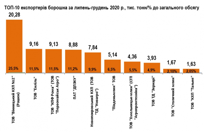 Список крупнейших экспортеров муки в первой половине 2020/21 МГ возглавляет «Винницкий КХП №2» (Roshen), за ним — ООО «Енлиль», третье место за ООО «КПФ Рома» («Первомайск Агро»).