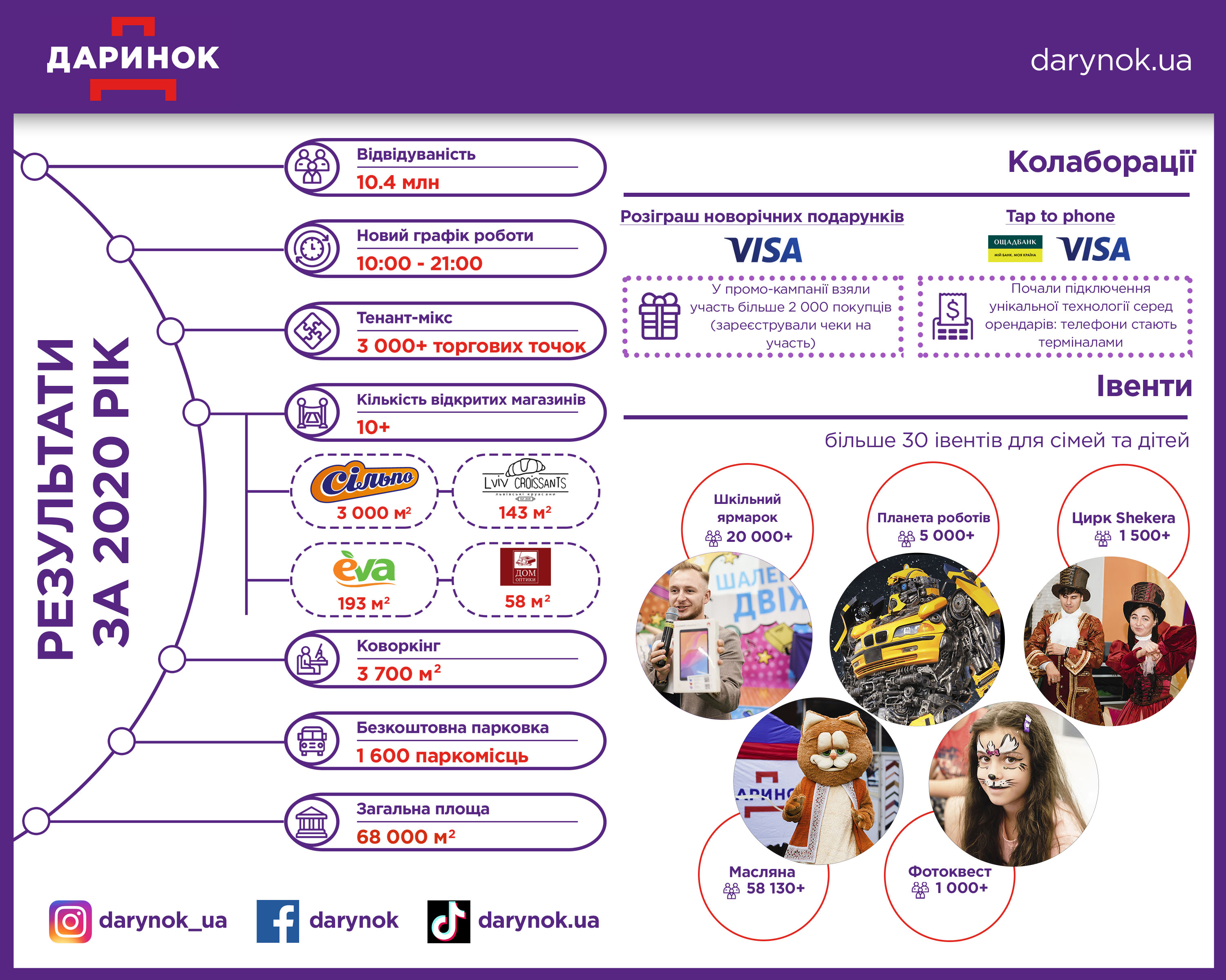10,4 млн посетителей, новый график работы с 10:00 до 21:00, больше 10 новых магазинов, две коллаборации с Visa и 30+ ивентов для гостей – столичный маркет-молл «Дарынок» подбил итоги работы в 2020 году. Что ещё в портфеле крупнейшего торгового объекта Киева – в материале далее.