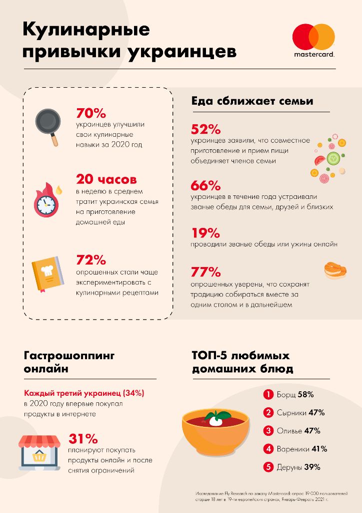 Согласно исследованию Mastercard, украинцы с начала карантина стали проводить на треть больше времени на кухне, две трети опрошенных устраивали званые обеды, а каждый пятый устраивал их онлайн.