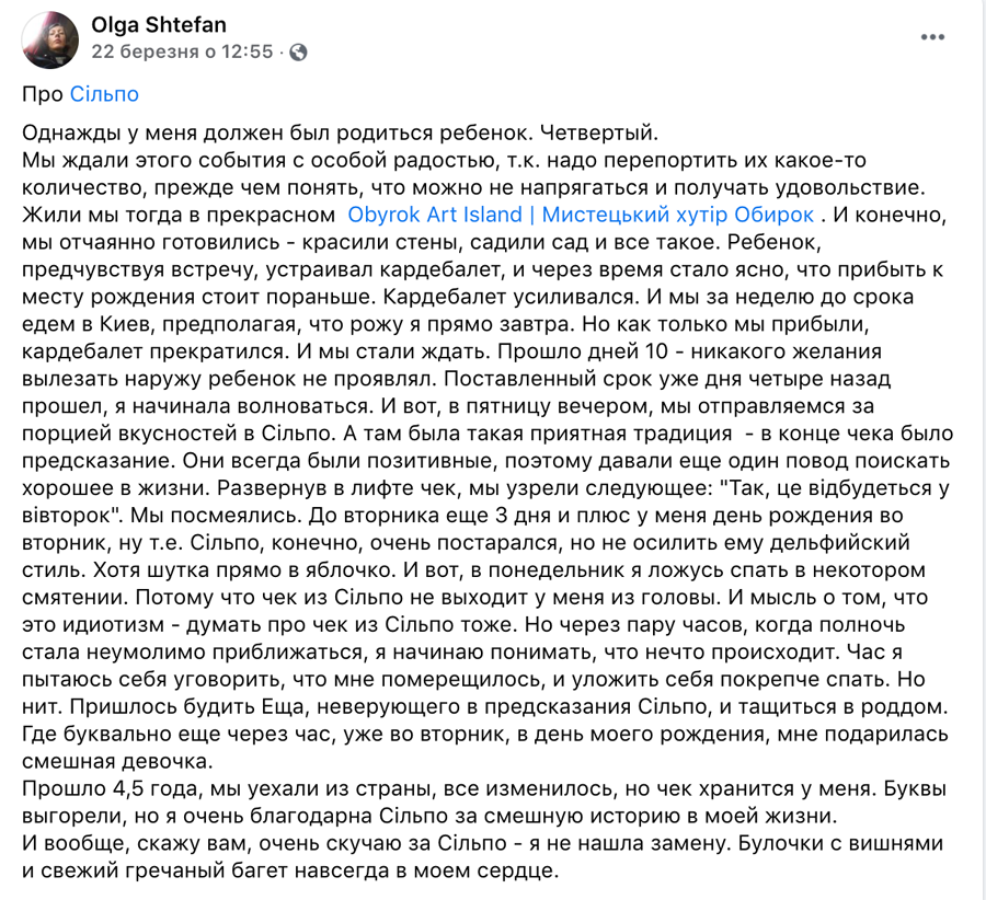 На днях сеть супермаркетов «Сільпо» была отмечена под сообщением Ольги Штефан. В публикации она рассказывает, как четыре года назад была на последнем месяце беременности и готовилась к родам, но малыш никак не хотел покидать мамин животик.