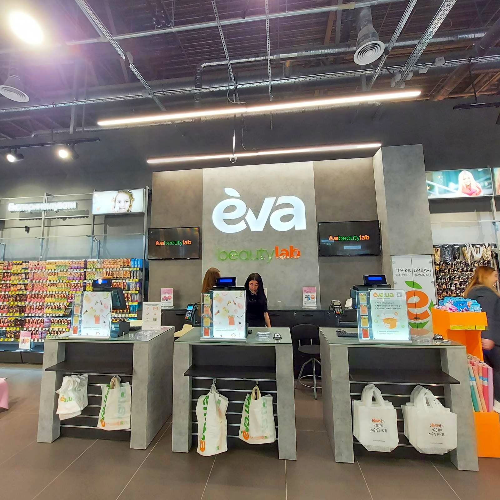 Общая площадь нового магазина в Киеве составляет 312,6 м², торговая — 276,1 м². Ассортимент охватывает около 15 000 SKU. В отличие от традиционных магазинов EVA, в beauty lab отсутствуют товары для дома и бытовая химия. Вместо этого здесь представлен расширенный ассортимент декоративной косметики, продуктов для ухода за лицом, телом и волосами, а также парфюмерии, бижутерии и аксессуаров.