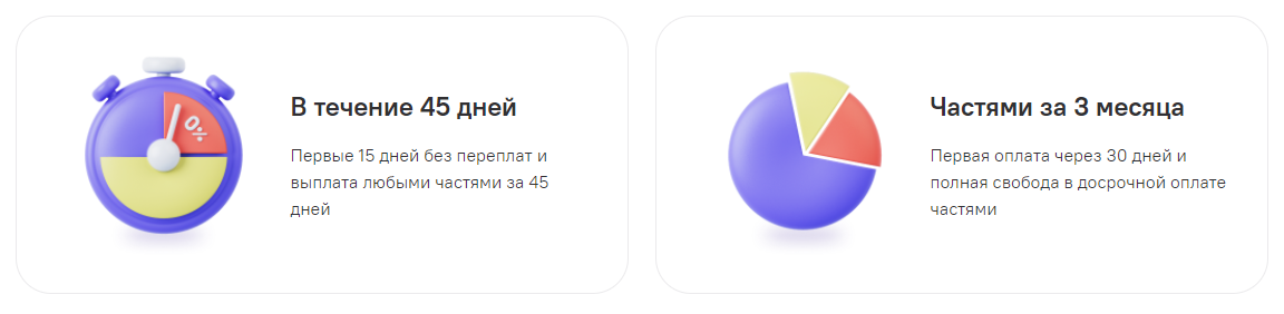 - Оплатить частями за срок 45 дней. При этом первые две недели будут предоставлены беспроцентно.