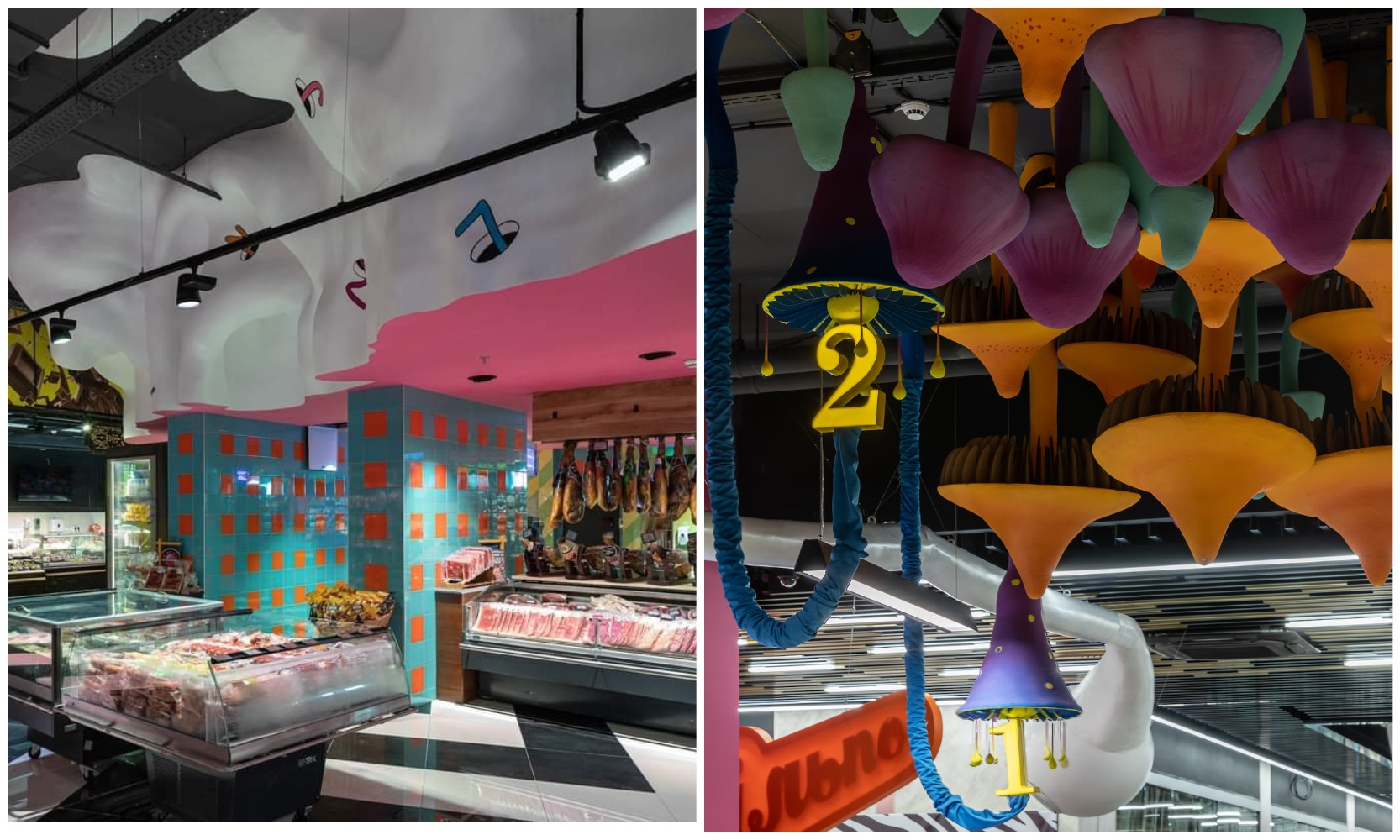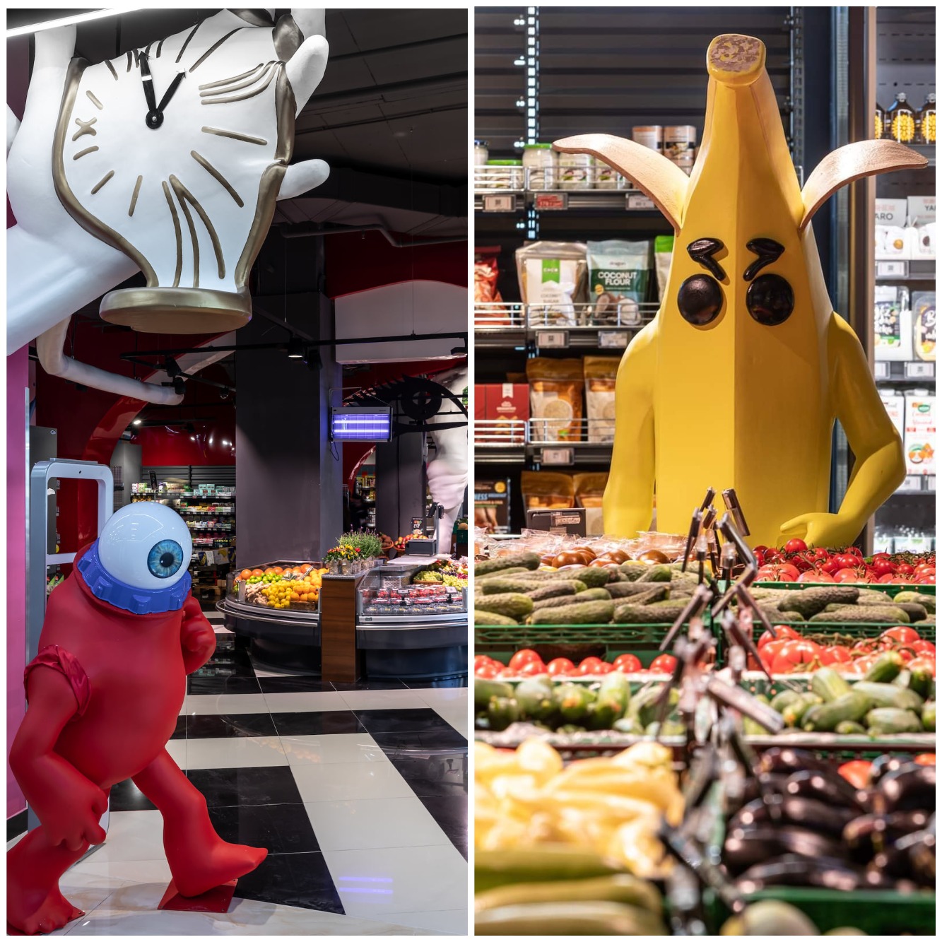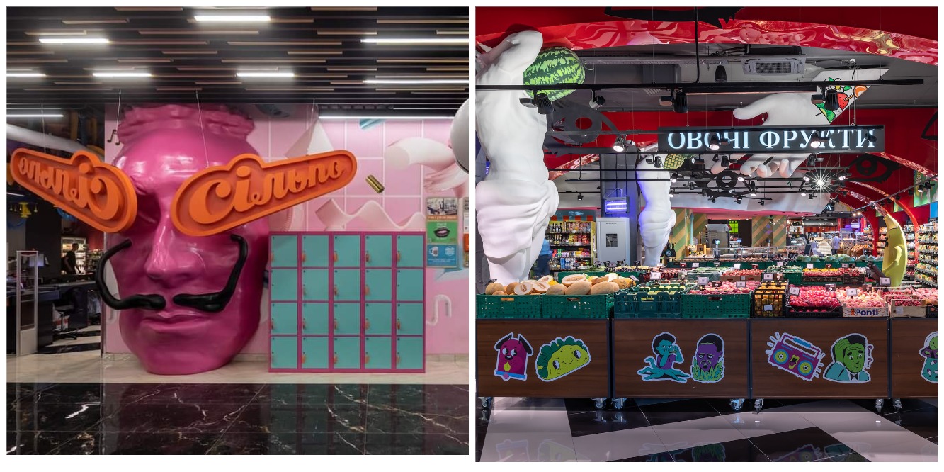 «1065 м2 торгового зала — макровсплески творческого вдохновения. На входе гостей встречает огромный фиолетовый анфас Дали, который смотрит всегда прямо на тебя, откуда бы ты подошел. Время с известного художественного образа художника стекает безапелляционно и скромно — с часов прямо в ведерко на полу. Внутри магазина — арт объекты, что на глазах гостей оживают и становятся субъектами. Полосатый черно-белый пол медленно реинкарнируется в зебру на колоннах. Атланты держат мир на плечах, потому что вместо головы у них то арбузы, то ананасы. Мраморные руки-глаза-ноздри простираются тропами чувственности над полками с вкусностями. В паузах между черных дыр на кислотно-цветных стенах из сыра шлют воздушные поцелуи неугомонные копии Мэрилин Монро. А неподалеку от касс на выходе из магазина вверх ногами выросла обильная поляна грибов.