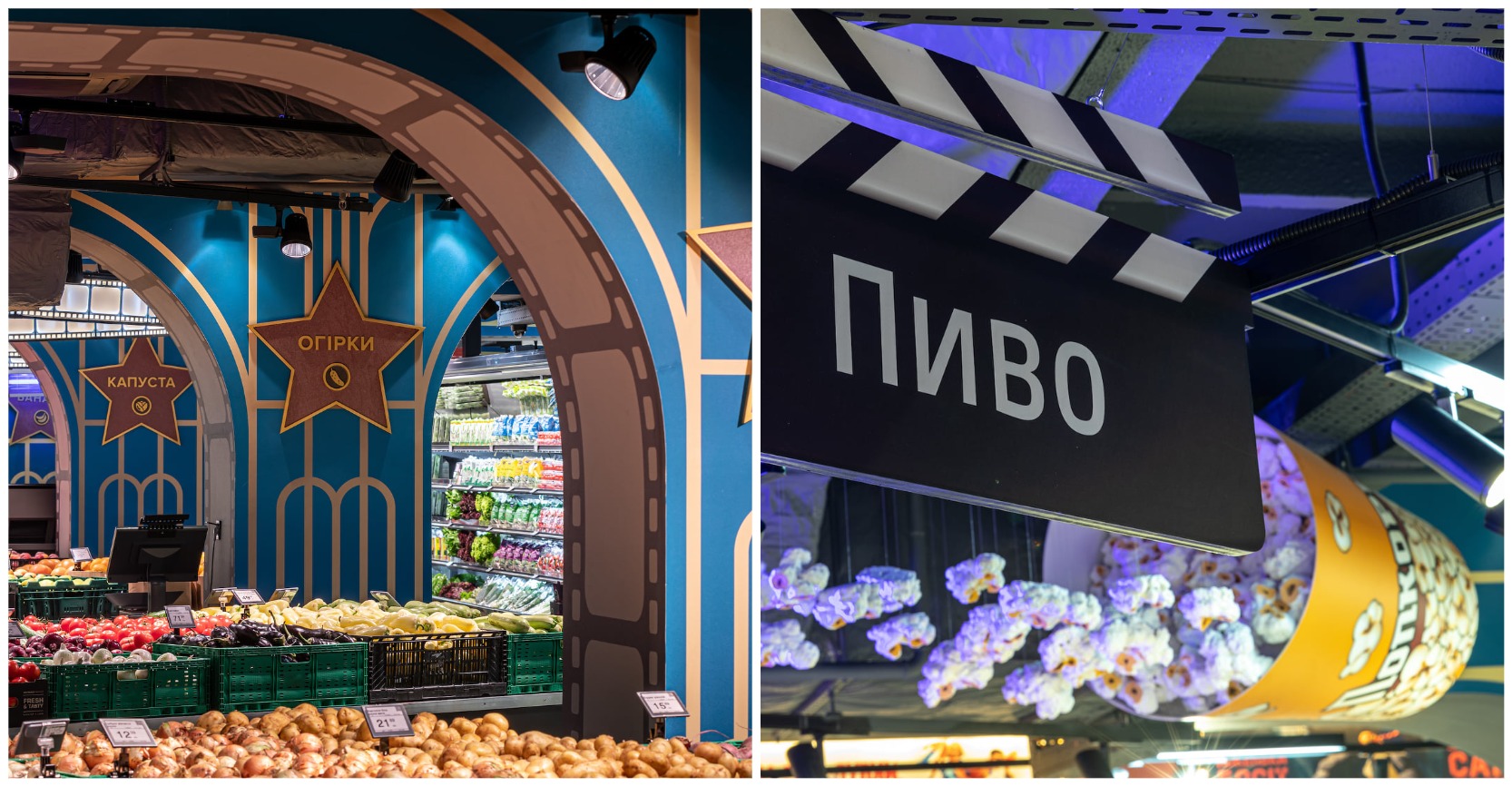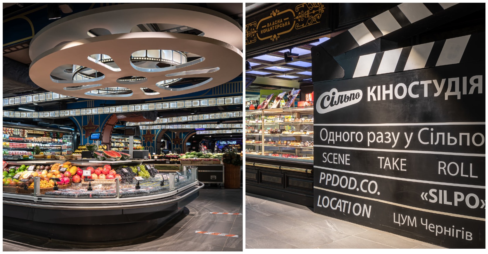 Настроение киношного бэкстейдж умножает огромное режиссерское кресло. Вокруг наготове камеры и рупоры, а прожекторы и софиты подсвечивают звездный состав полок. В новом «Сільпо» есть пекарня на дровах, гриль, пицца, кулинария, Собственная кондитерская, копчения и соления рыбы, кофейный и цветочный бутики, островок Лавка Традиций и торжественный отдел с хамоном и искусными кортадорамы. Над отделом по богатым выбором рыбы размещена декорация в духе «Челюстей» — акула, «зафарширована» динамическим механизмом. Над отделением овощей и фруктов медитативно шуршит от оборотов огромная бобина с пленкой.