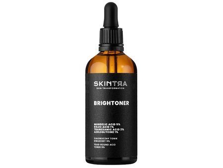 SkinTra — Brightoner — кислотный тоник, предназначенный для домашнего использования круглый год. В его состав входят: миндальная кислота, койевая кислота, транексамовая кислота, азелоглицин и витамин С, оказывающие отшелушивающее действие, разглаживают и осветляют кожу, а благодаря свойствам, подавляющим активность фермента тирозиназы, снижается синтез меланина, тем самым снижается риск появления новых пигментных пятен. Тоник ослабляет связи клеток эпидермиса, ускоряя физиологический процесс отшелушивания, кроме того, постепенно осветляет пигментные пятна. Он хорошо подходит для тусклой, лишенной блеска, загрязненной кожи с пигментными пятнами, а также со склонностью к образованию черных точек и появлению высыпаний.