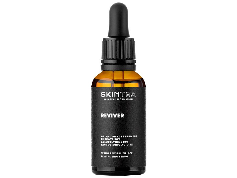 SkinTra — Reviver — сыворотка на водной основе, богатая активными компонентами. Имеет сильное антиоксидантное действие, помогает снять воспаление, ускорить регенерацию кожи и замедлить процесс старения. Средство улучшает уровень увлажнения даже очень сухой кожи, удерживая влагу в эпидермисе и впитывая ее из окружающей среды. Осветление пигментных пятен осуществляется двумя способами: стимуляцией физиологического процесса обновления клеток, отшелушивая постепенно гиперпигментацию, при этом снижается синтез меланина (пигмента кожи), благодаря чему минимизируется тенденция к появлению новых пигментных пятен. Подходит для всех типов кожи, для утреннего и вечернего ухода.