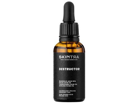 SkinTra — Destructor — кислотный пилинг, предназначенный для домашнего ухода круглый год. В его состав входят: миндальная кислота, койевая кислота, транексамовая кислота, азелоглицин и витамин С. Высокая концентрация кислот (24%) активно отшелушивает, разглаживает и осветляет кожу. Также благодаря свойствам, которые подавляют активность фермента тирозиназы, средство снижает синтез меланина, тем самым снижая риск появления новых пигментных пятен. Пилинг обладает противовоспалительными свойствами. Если ваша кожа имеет неровный тон, лишенная блеска, тусклая и с черными точками и высыпаниями — это MUST HAVE! Данное средство способно удивить. Оно обеспечивает видимый эффект домашних процедур после первого использования. Средство не обладает фототоксическим и фотосенсибилизирующим потенциалом, его pH 2,7.