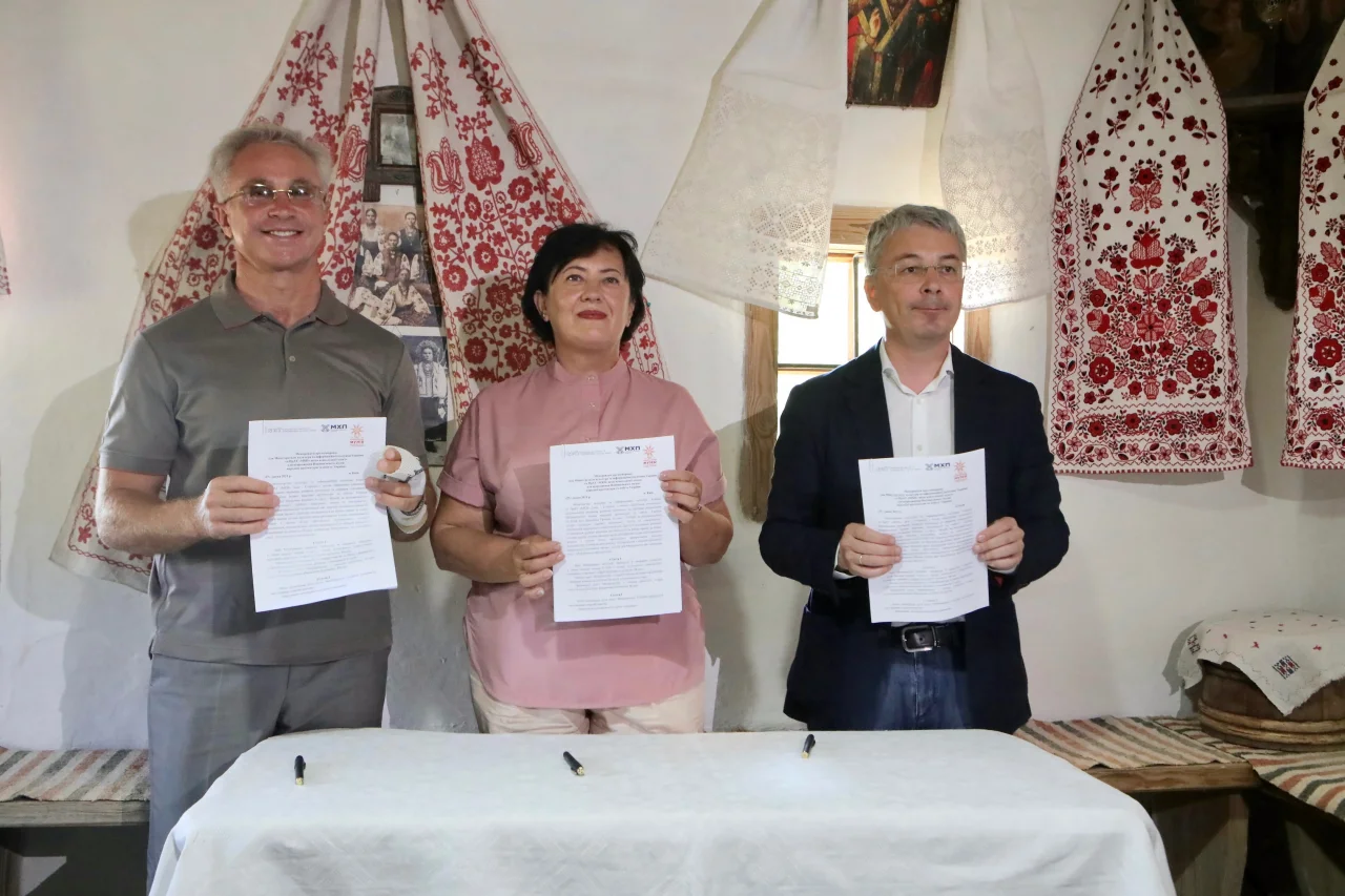 Документ подписали: Юрий Косюк, глава правления МХП; Александр Ткаченко, министр культуры и информационной политики Украины; Оксана Повякель, генеральный директор Национального музея народной архитектуры и быта Украины.