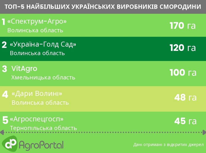 «По данным Института садоводства, площади смородиновых насаждений составляют около 4 тыс. га, из них около 1,5 тыс. га — это промышленные плантации. Крупные производители ягоды есть на Волыни, Хмельнитчине, Тернопольщине», — отмечает Тарас Баштанник.